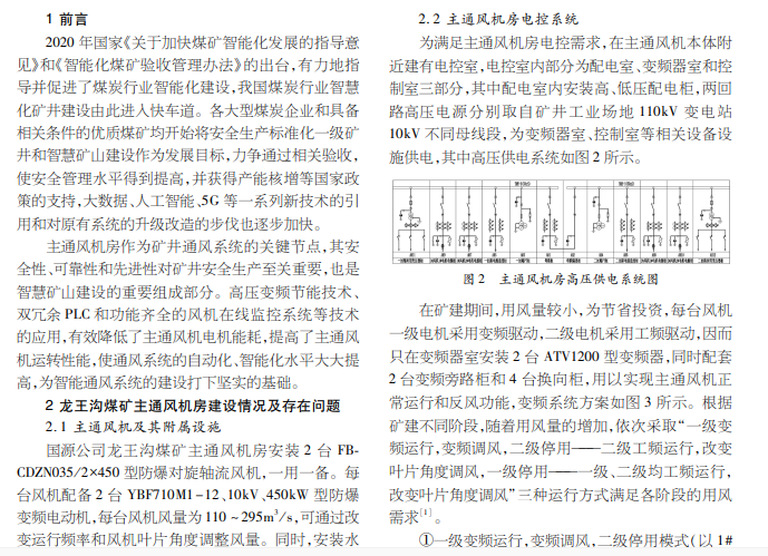 在龙王沟煤矿针对矿建期间,主通风机房电控系统设计存在安装不合理,系统复杂,能耗较大,可靠性不高,风机 在线监控系统功能不全的问题。