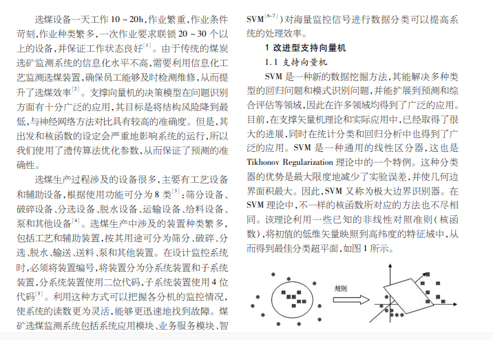 为解决选煤设备工作强度大,运行时间长而造成磨损与破坏,从而影响生产问题,设计研究了一种改进型支持向 量机算法分析选煤设备的监控状态数据,实现对设备结构状态的在线监控。