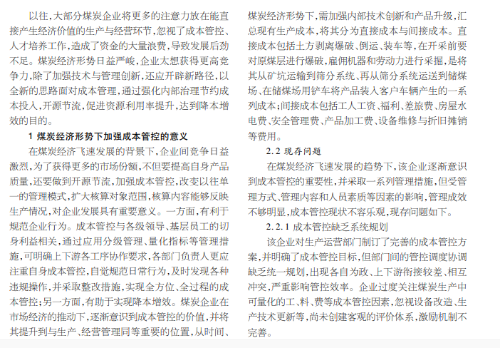 本文以煤炭企业为例,阐述加强成本管控意义,结合案例,立足成本管控现状。