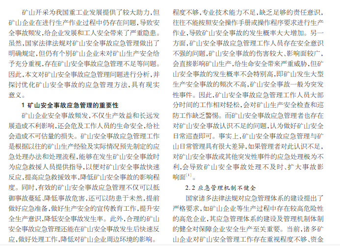 生产安全关乎矿山企业根本利益,矿山工作人员的生命安全,关乎矿山周边环境和居民健康,而强化矿山安全事 故的应急管理能有效降低矿山安全事故的影响范围和影响程度。