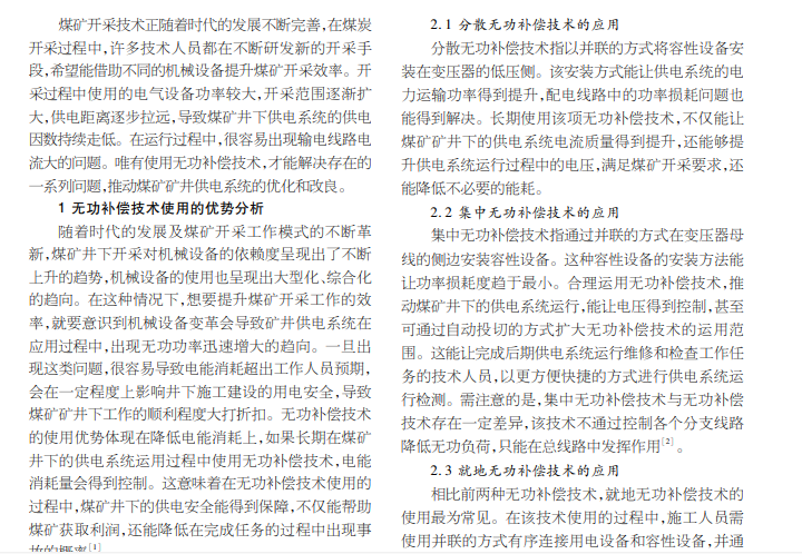 为推动煤矿矿井供电系统的建设,进一步提升用电效率,使输电线路和变压器的功能得到发挥,技术人员研发了 无功补偿技术。