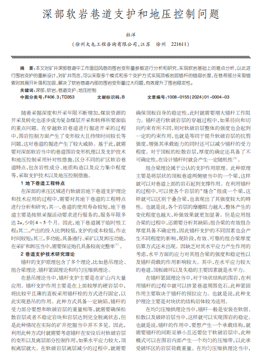 本文对矿井深部巷道中工作面回风巷的围岩变形量参数进行分析和研究,实现软岩基础上的难点分析,以此进行围岩支护的重新设计,对矿井而言,可以采取多个模式和多个支护方式实现顶板岩层锚杆的锚固长度,在巷帮部分采取锚索对其展开补强和加固,解决了软岩巷道内部的围岩变形量过大问题,有效提升了围岩稳定性。