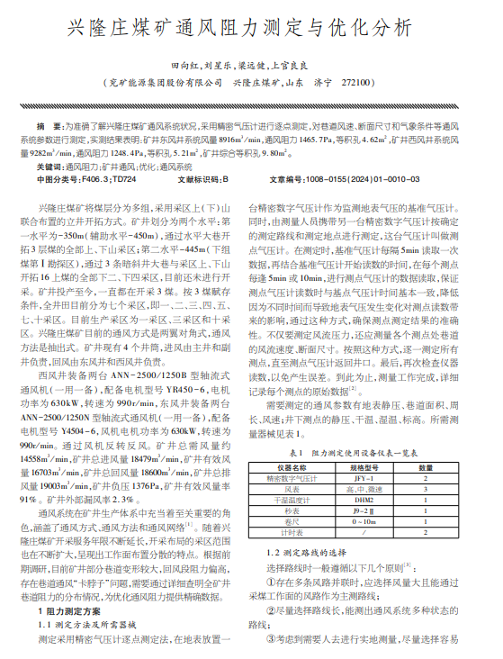 为准确了解兴隆庄煤矿通风系统状况,采用精密气压计进行逐点测定,对巷道风速寸断面尺寸和气象条件等通风系统参数进行测定。