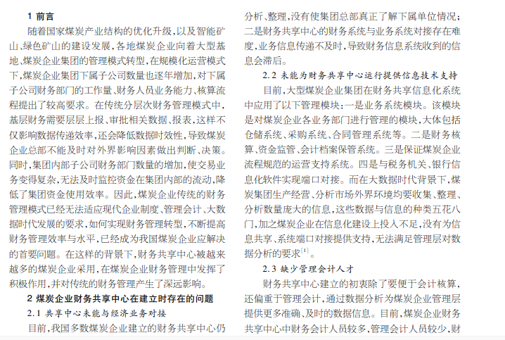 在大数据背景下,本文对煤炭企业财务共享中 心建立存在的问题进行分析,提出了优化煤炭企业财务共享中心的若干策略。