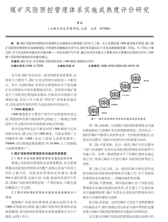 煤矿风险预控管理体系是煤炭企业提高安全管理能力的有力工具。本文试图依据CMM模型基本原理,建立煤矿风险预控管理体系成熟度模型,并希望利用模糊综合评价法,确定体系建设处于体系成熟度模型哪一阶段。