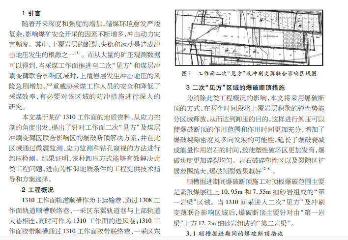 本文基于某矿工 作面的地质条件和开采方法,探究以爆破断顶为主的卸压方法对改善此类工程问题的有效性。