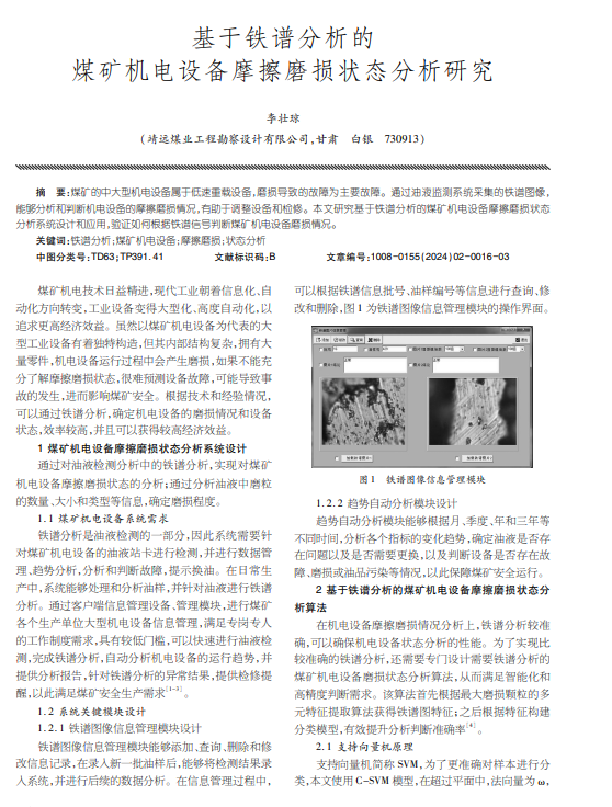 煤矿的中大型机电设备属于低速重载设备,磨损导致的故障为主要故障。通过油液监测系统采集的铁谱图像,能够分析和判断机电设备的摩擦磨损情况,有助于调整设备和检修。
