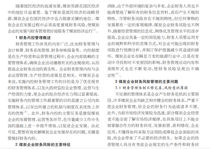 为了避免问题的产生,煤炭企业要建立健全经营风险管理体系,完善企业风险意识,改善企业经营财务 管理机制。
