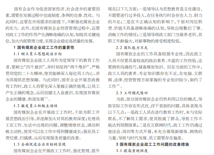 在国有煤炭企业的发展过程中,强化政工工作质量不仅是稳固共产党执政的重要措施。