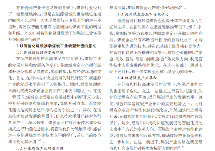 本文从智能化建设推动 煤炭工业转型升级的意义,发展方向以及建议三方面入手,研究智能化建设推动煤炭工业转型升级的策略。