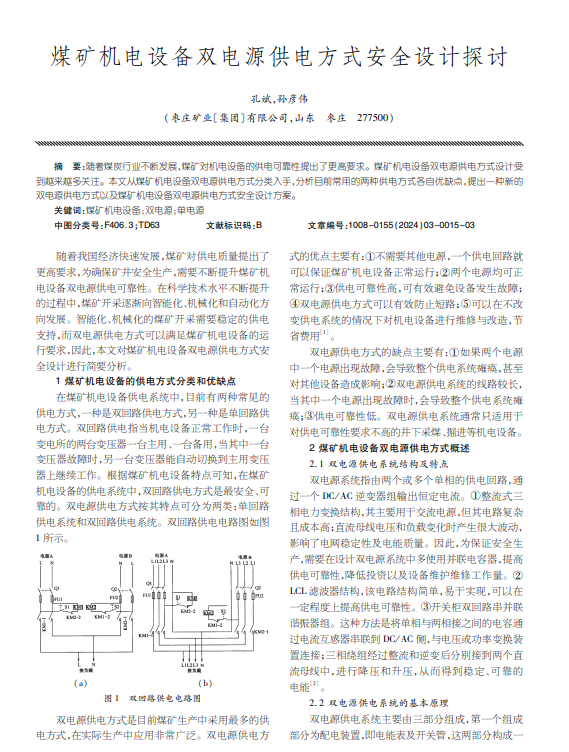 随着煤炭行业不断发展,煤矿对机电设备的供电可靠性提出了更高要求。煤矿机电设备双电源供电方式设计受 到越来越多关注。本文从煤矿机电设备双电源供电方式分类入手,分析目前常用的两种供电方式各自优缺点,提出一种新的 双电源供电方式以及煤矿机电设备双电源供电方式安全设计方案。