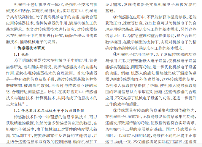 本文结合实际情况,简单分析传感器技术,以此为基础,研究传感器技术在机械电子中的应用。