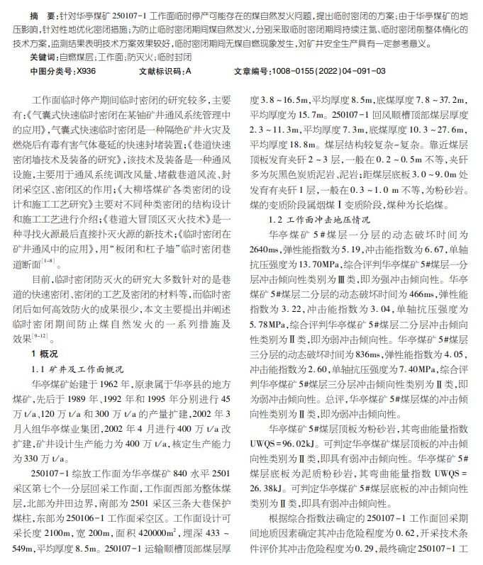 自燃煤层工作面临时封闭及防灭火技术