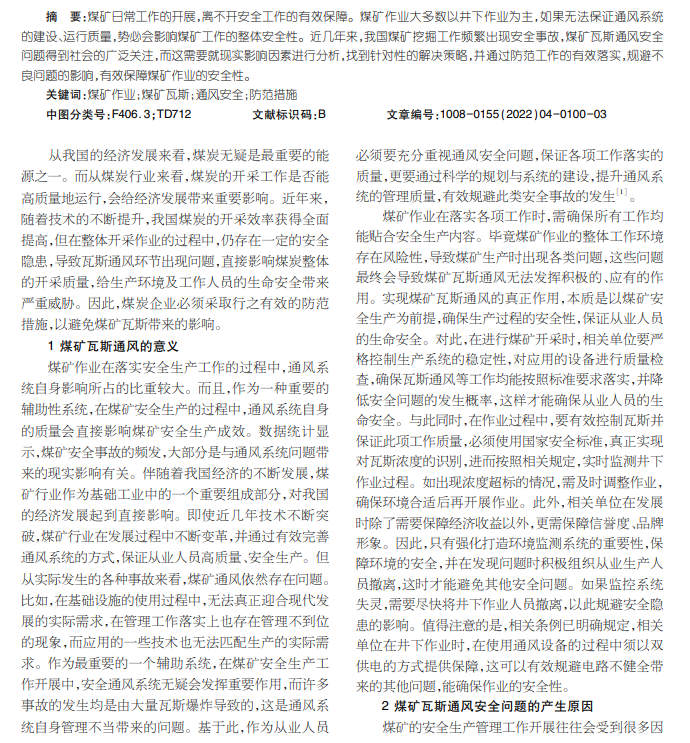 煤矿瓦斯的通风安全问题与防范措施