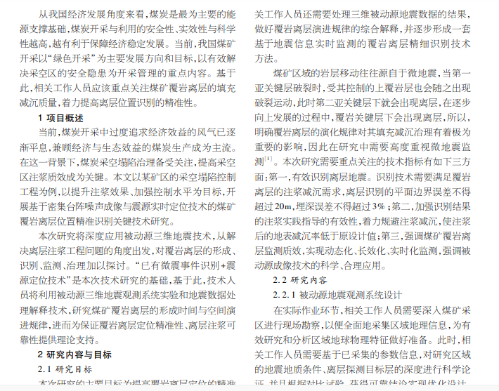 在实践中!煤矿采空区容易出现顶板覆岩离层。为了保证完成覆岩离层注浆!需要对离层位置进行准确识别。 基于此,本文结合实践工作经验,从密集台阵噪声成像与震源实时定位技术有效应用的角度出发,对煤矿覆岩离层位置精准 识别关键技术加以分析,以期为相关工作人员提供参考。