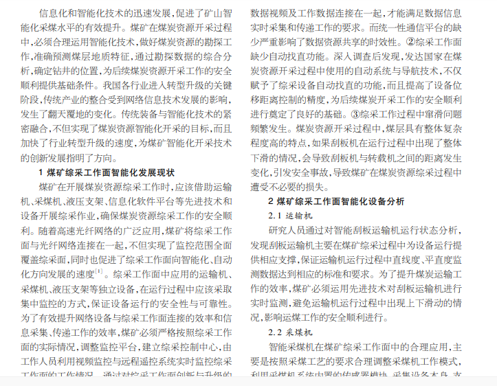 信息化技术的迅速发展,促进了煤炭行业向信息化,智能化方向发展,煤矿构建的智能化煤炭资源开采系统被广 泛应用于煤矿综采面中,实现了煤炭资源无任何开采的目的,同时促进了综采技术的全面发展。