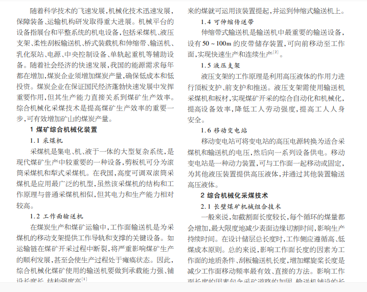 综合机械化采煤技术对煤矿的有效运行,保证煤矿的生态安全生产有重要意义,在分析煤矿综合机械化设备现 状的基础上,研究煤矿不同工艺的特点,使煤矿有机会选择合理的技术。