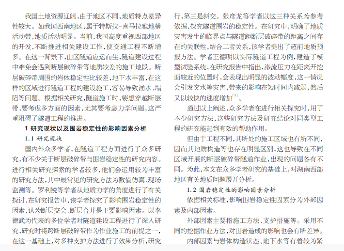 隧道工程建设过程中,断层破碎带周围岩体具有明显的不稳定性,受这一特点的影响,坍塌等事件出现概率较 高,其已经成为施工作业过程中需要注意的重点问题。