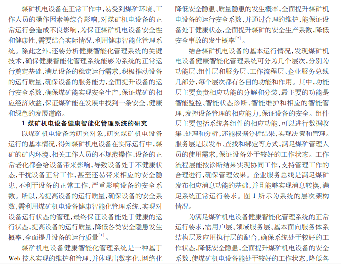 本文结合实际情况,研究煤矿机电设备的健康智能化管理系统,在此基础上,研究智能化管理系统的相应关键技 术。