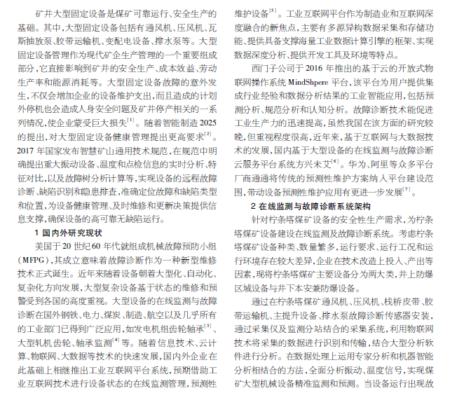 煤矿行业中大型固定设备是企业安全可靠生产的核心设备,对其实时监测与风险评估有重要实用价值。