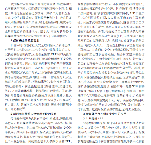 针对传统煤矿安全存在的诸多问题,介绍了新形势下新媒体技术在煤矿安全中的应用趋势。