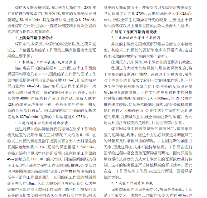 本文主要研究的煤矿综采工作面进行回采工作的现实情况,对高浓度瓦斯为什么会在上隅角这个位置聚积以及如何治理上隅角位置聚积的瓦斯这两个问题提出有效防治措施。