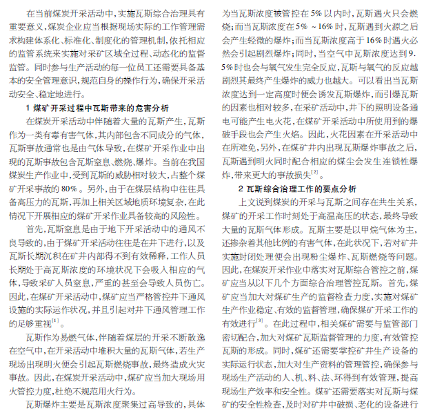 在煤矿开采过程中实施对瓦斯综合管控现实意义较大,在此过程中!煤矿应当加大现场管理力度,有效隔绝瓦斯燃烧与引爆的因素,采取行之有效的管控措施,优化现有的采矿管理流程。