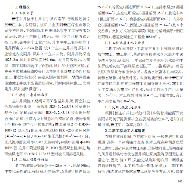 本文基于庆阳新庄煤业有限公司新庄煤矿副井二期巷道及硐室施工,采用施工井筒的一期设备及系统进行施