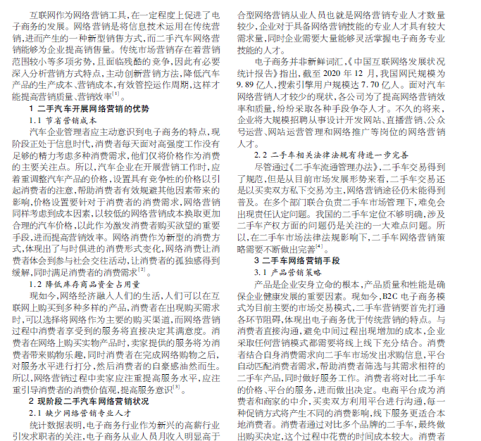 网络营销是营销观念的更新,其提高了二手车的销售量,对比传统市场营销,网络营销的范围更广。