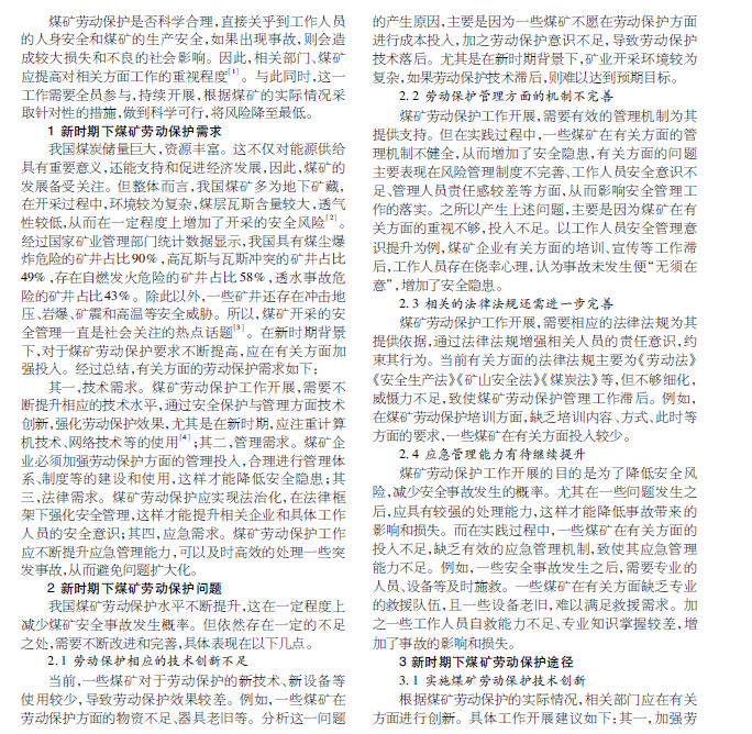 新时期背景下,煤矿应注重劳动保护方面的经费投入,通过有效的劳动保护维护具体工作人员的利益。
