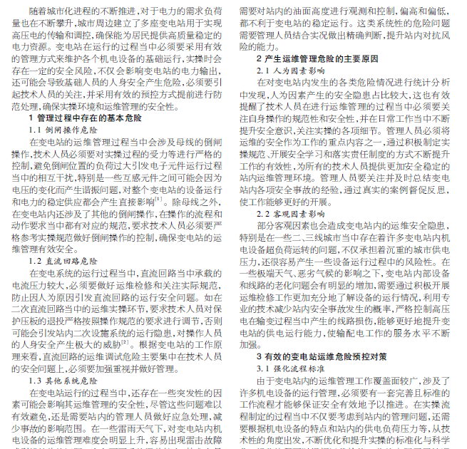 在社会经济与科技飞速进步的背景之下,变电站的建设承担着沉重的城市用电负荷,必须要定期开展运维管理才能够保证各类机电设备的稳定运转。