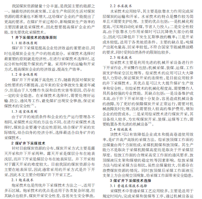 本文首先介绍了目前主要应用的煤矿井下采煤技术。