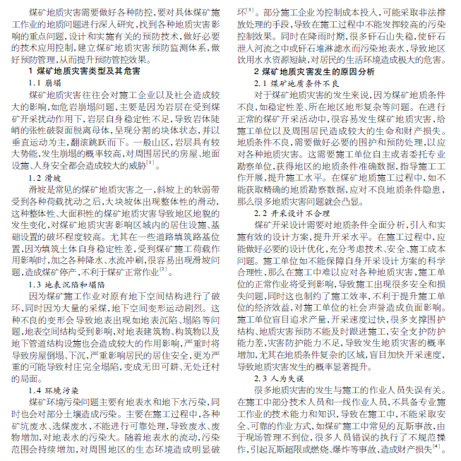在预防技术的应用中,施工单位要强化煤矿通风管理,加强顶板安全管理,重视有关防治水工作#控制地表变形和地面沉陷问题#控制污染问题,对各种灾害进行全面防控,突出防控效果。