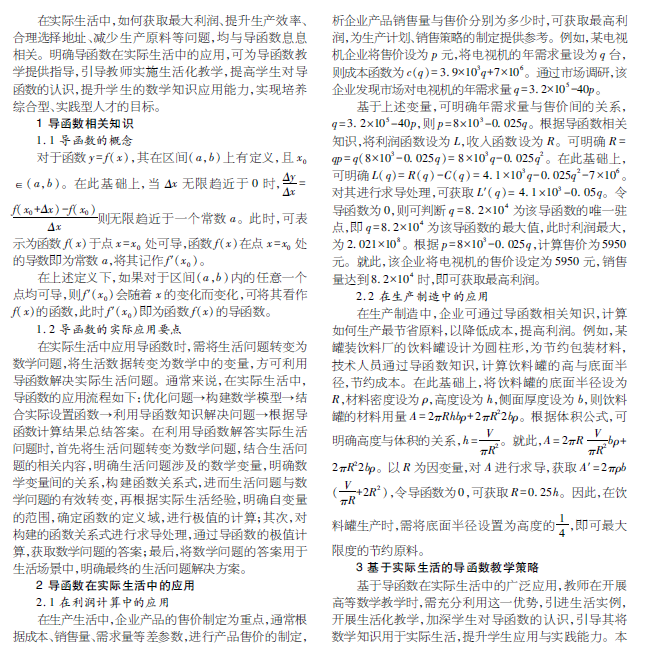 导函数为高等数学的基础内容,应用于物理,化学及工程技术等多个学科,在实际生活中的应用也十分广泛。