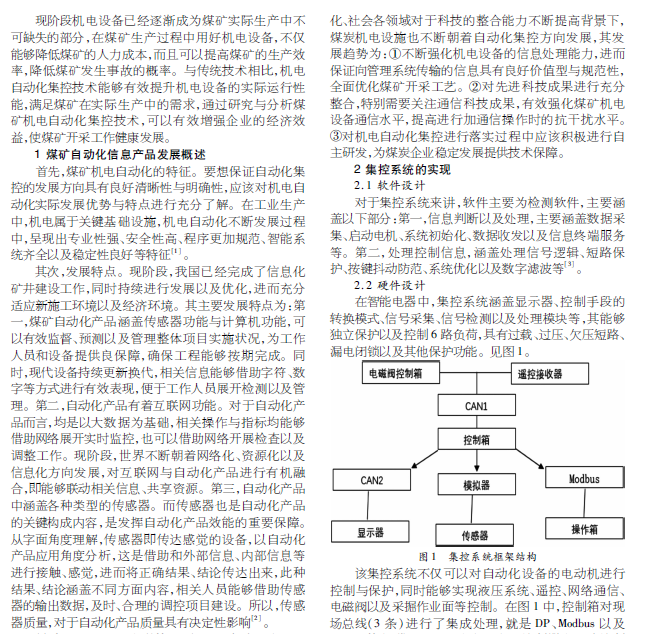 随着我国经济的迅猛发展,人们的环保意识不断增强,煤矿行业逐渐向着智能自动化集控的方向发展,特别是一部分煤矿机电设备项目有效加强了机电自动化集控方向的控制。