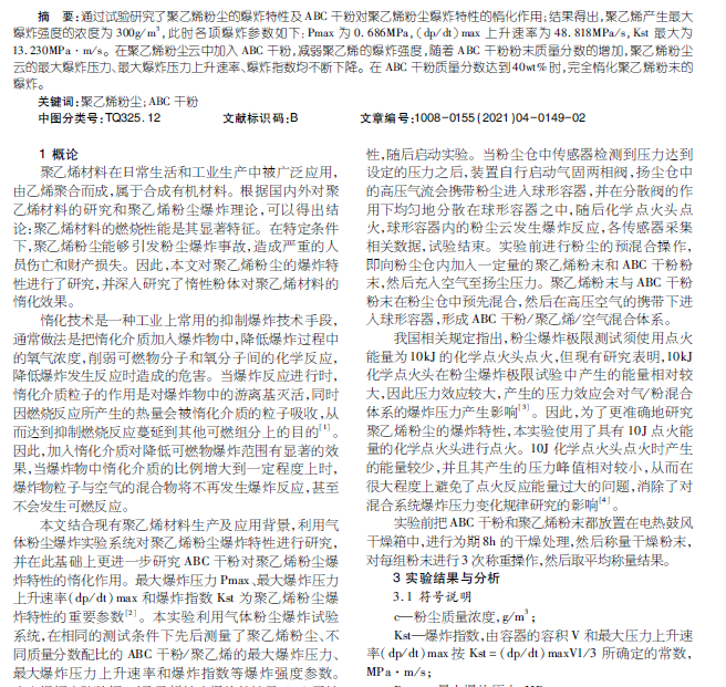 ABC干粉对聚乙烯粉尘爆炸特性的惰化作用