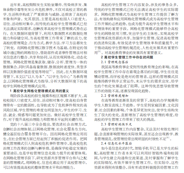网格化管理模式与传统的管理模式相比,可以及时发现学生在学习和生活中存在的问题,及时采取有效措施解决,对于加强高校资源整合,提高管理水平,提升管理效率有重要作用。