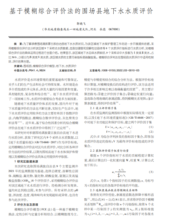 为了解承德围场满族蒙古族自治县地下水水质状况,为该区域地下水保护管理工作的进一步开展提供依据,采用模糊综合评价法分析该区域9个采样点水质数据,选取总硬度和溶解性总固体等8个水质评价指标进行水质分析,对模糊综合评价法的具体运用过程进行全面介绍.结果显示,该区域地下水总体水质较好,9个采样点中大多数为Ⅰ类或Ⅱ类水,占比56%,少部分为Ⅳ类或Ⅴ类水质,该区域水质的主要污染指标是硝酸盐氮.模糊综合评判法在围场县水质评价中适用性较好,评价结果合理.