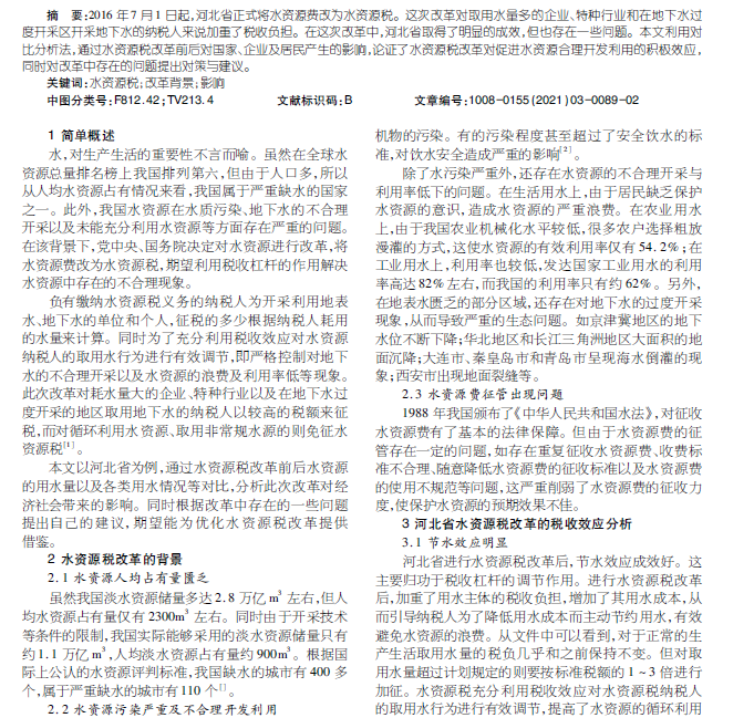 水资源税改革的税收效应分析——以河北省为例