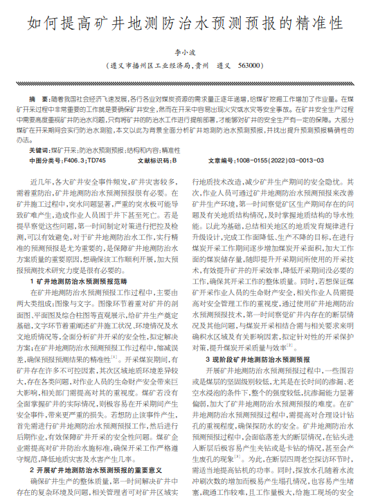 随着我国社会经济飞速发展,各行各业对煤炭资源的需求量正逐年递增,给煤矿挖掘工作增加了作业量.在煤矿开采过程中非常重要的工作就是要确保矿井安全,然而在开采中容易出现火灾或水灾等安全事故.在矿井安全生产过程中需要高度重视矿井防治水问题,只有将矿井的防治水工作进行提前部署,才能够对矿井的安全生产有一定的保障.大部分煤矿在开采期间会实行防治水测验,本文以此为背景全面分析矿井地测防治水预测预报,并找出提升预测预报精确性的办法.