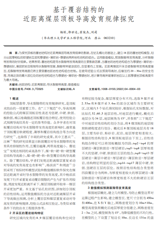 为探究顶板的覆岩结构对近距离煤层导高发育规律的影响,在钻孔概化的基础上,建立18层的覆岩结构模型,划分出层厚相似的软硬岩互层和厚硬岩-薄软岩-厚硬岩两种岩性结构的组合.运用数值模拟,预测裂隙带发育高度,分析裂隙带发育的时空规律.结果表明:覆岩结构是导水裂隙带发育高度的主要影响因素,当覆岩的岩性结构组合为厚硬岩-薄软岩-厚硬岩时,薄层软岩会限制导水裂隙带发展,裂隙带突破该层后,会显著向上发展.近距离煤层开采会使裂隙带发育高度增加,但裂隙带发育高度仍然主要受覆岩层岩性结构组合控制.在使用经验公式法预测导高时,应增加约20~30m的安全范围,导高达到的最大层位处的岩性结构组合为厚硬岩-薄软岩-厚硬岩时,若计算导高突破薄软岩应以上层厚硬岩顶板高度作为最大导高.