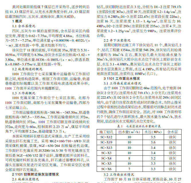 受底板承压水威胁工作面在采取了地面区域治理后,因长时间停采,造成工作面架前及工作面超前10m 范围内巷道底板出现裂隙并涌水。