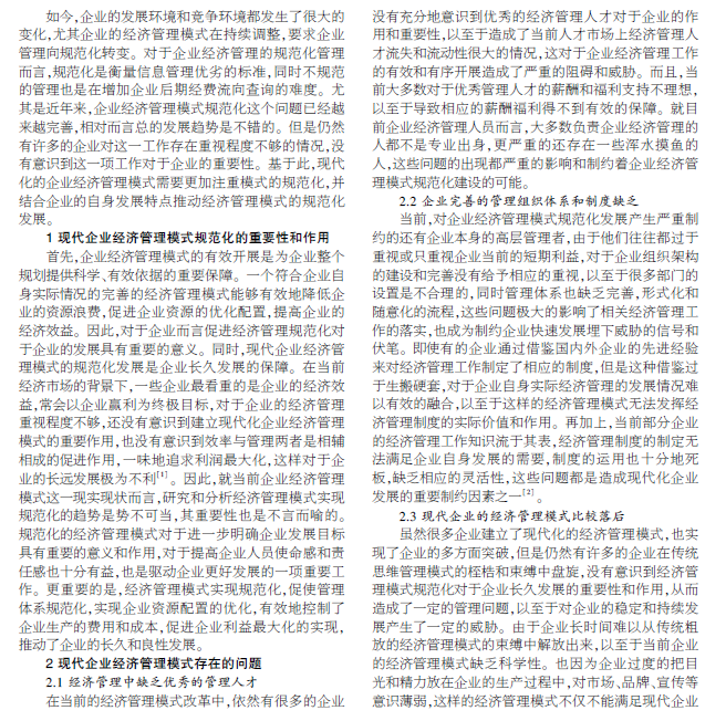 作为企业生存发展过程中的一项重要工作,企业经济管理的规范程度对于企业的实际运营质量具有直接影响。