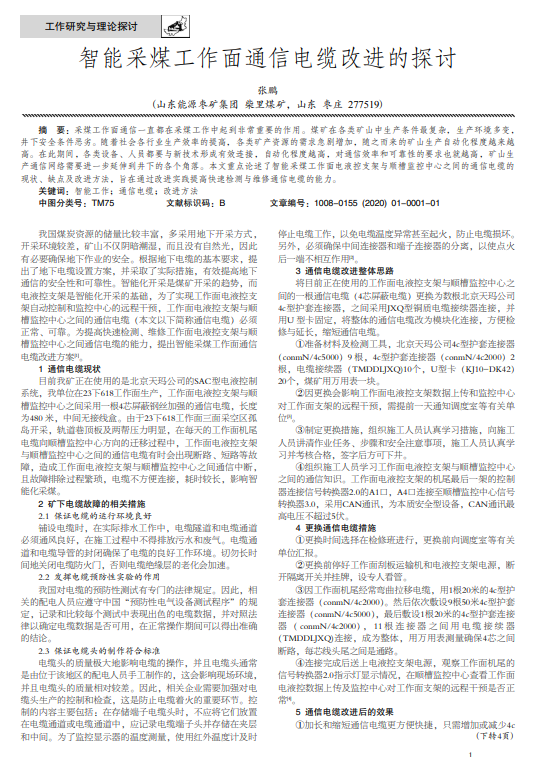 采煤工作面通信一直都在采煤工作中起到非常重要的作用。煤矿在各类矿山中生产条件最复杂,生产环境多变, 井下安全条件恶劣。随着社会各行业生产效率的提高,各类矿产资源的需求急剧增加,随之而来的矿山生产自动化程度越来越 高。在此期间,各类设备、人员都要与新技术形成有效连接,自动化程度越高,对通信效率和可靠性的要求也就越高,矿山生 产通信网络需要进一步延伸到井下的各个角落。本文重点论述了智能采煤工作面电液控支架与顺槽监控中心之间的通信电缆的 现状、缺点及改进方法,旨在通过改进实践提高快速检测与维修通信电缆的能力。