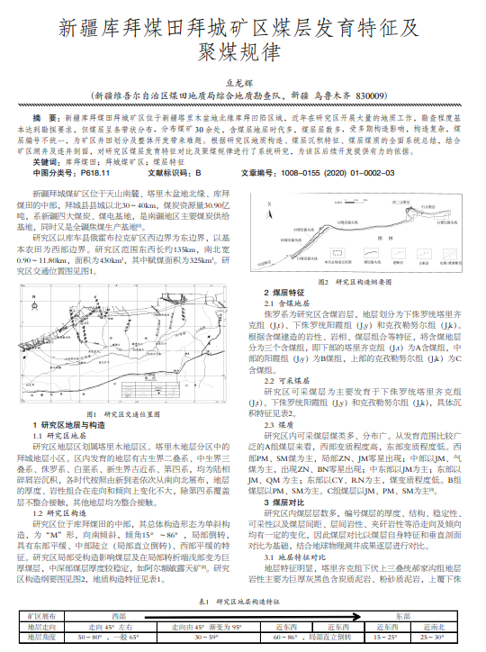 新疆库拜煤田拜城矿区位于新疆塔里木盆地北缘库拜凹陷区域,近年在研究区开展大量的地质工作,勘查程度基 本达到勘探要求,但煤层呈条带状分布,分布煤矿 30 余处,含煤层地层时代多,煤层层数多,受多期构造影响,构造复杂,煤 层编号不统一,为矿区井田划分及整体开发带来难题。根据研究区地质构造、煤层沉积特征、煤层煤质的全面系统总结,结合 矿区测井及连井剖面,对研究区煤层发育特征对比及聚煤规律进行了系统研究,为该区后续开发提供有力的依据。