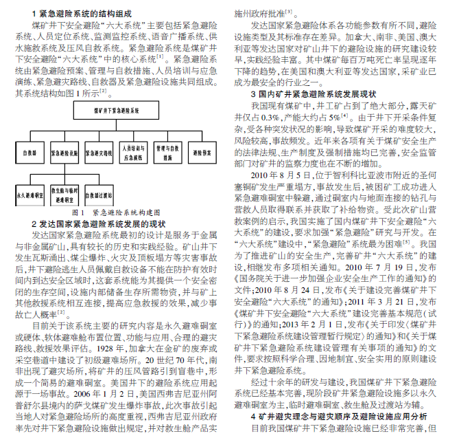 本文基于现阶段我国煤矿井下紧急避险设施的研究与总体建设情况,阐明了井工煤矿紧急避险系统的结构组成。
