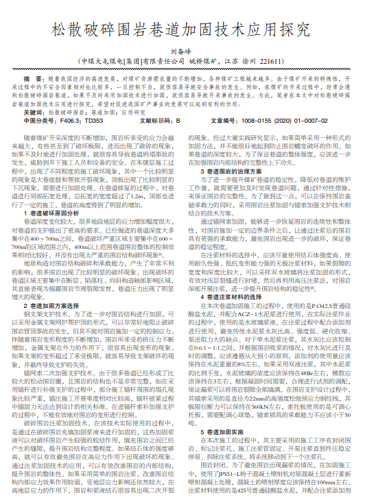 随着我国经济的高速发展,对煤矿资源需求量的不断增加,各种煤矿工程越来越多。由于煤矿开采的特殊性,开 采过程中的不安全因素相对也比较多,一旦控制不当,就很容易导致安全事故的发生。例如,在煤矿的开采过程中,经常会遇 到松散破碎围岩巷道,如果不及时采用加固技术进行加固,就很容易导致开采事故的发生。为此,笔者在本文中对松散破碎围 岩巷道加固技术应用进行探究,希望对促进我国矿产事业的发展可以起到有利的作用。