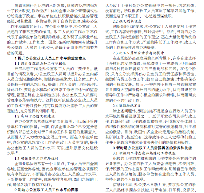 本文首先讲述了提升办公室政工人员工作水平的意义;其次分析了影响办公室政工人员工作水平的因素。