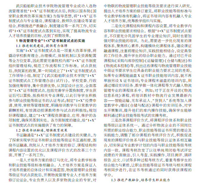 :“1+X”证书制度是一种深化复合型技术的技能人才培养模式和评价模式,物流管理是首批试点的5 个职业领域之一。