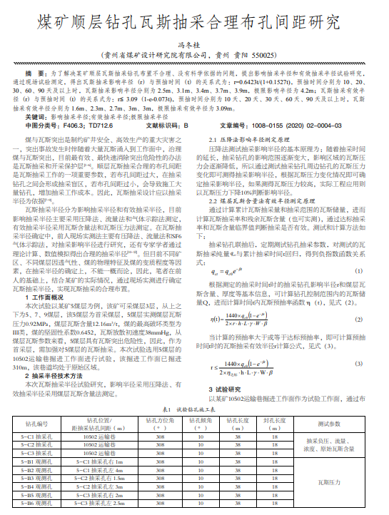 为了解决某矿顺层瓦斯抽采钻孔布置不合理、没有科学依据的问题,提出影响抽采半径和有效抽采半径试验研究, 通过现场试验测定,得出瓦斯抽采影响半径 (r) 与预抽时间 (t) 的关系式为:r=0.6423t/(1+0.1527t),预抽时间分别为 10、20、 30、60、90 天及以上时,瓦斯抽采影响半径分别为 2.5m、3.1m、3.4m、3.7m、3.9m,极限影响半径为 4.2m;瓦斯抽采有效半 径 (r) 与预抽时间 (t) 的关系式为:r≤ 3.09 (1-e-0.073t),预抽时间分别为 10 天、20 天、30 天、60 天、90 天及以上时,瓦斯 抽采有效半径分别为 1.6m、2.3m、2.7m、3m、3m,极限抽采有效半径为 3.09m。